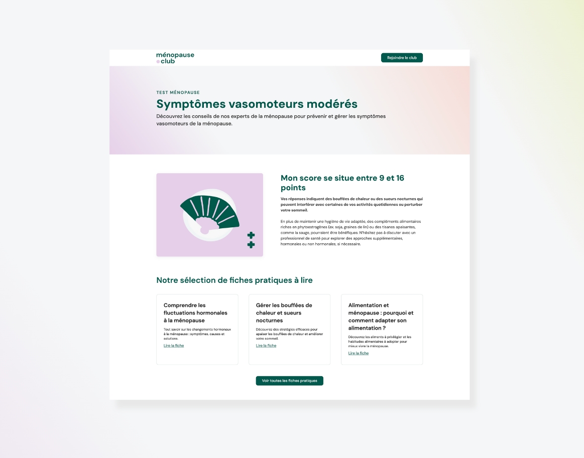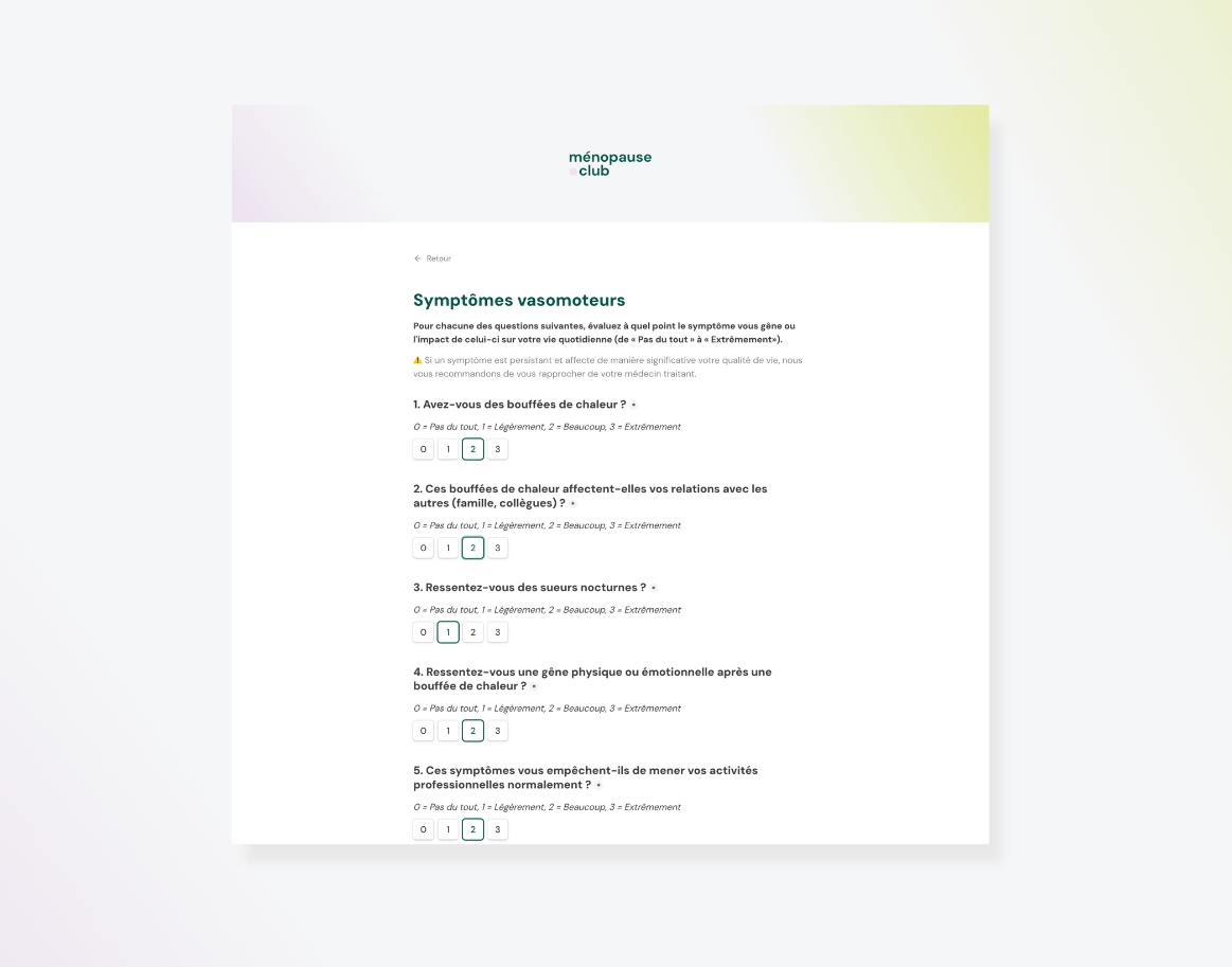 Évaluez vos symptômes, leurs impacts sur votre quotidien, et recevez des recommandations personnalisées avec notre questionnaire MenoScore.